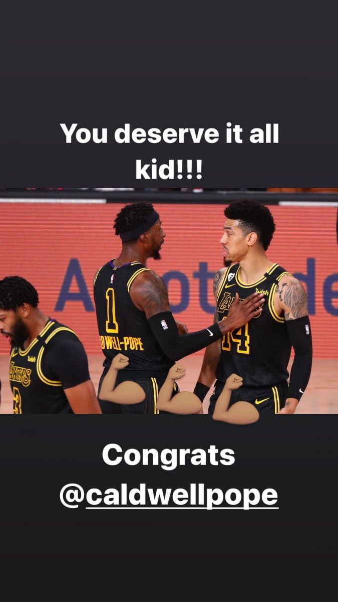 90看球网11月22日讯 76人后卫丹尼-格林更新Instagram Story,晒照恭喜肯塔维厄斯-考德威尔-波普与湖人达成价值3年4000万美元的续约协议。