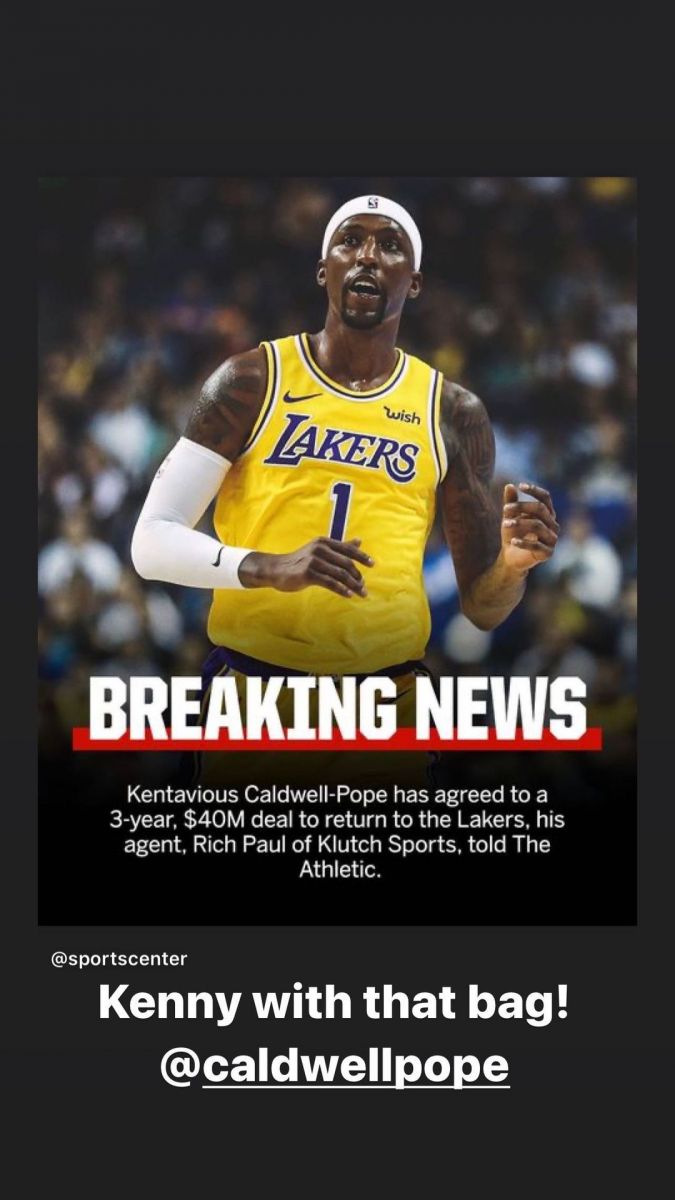 90看球网11月22日讯 湖人前锋凯尔-库兹马今日更新Instagram Story,祝贺队友肯塔维厄斯-考德威尔-波普续约留队。