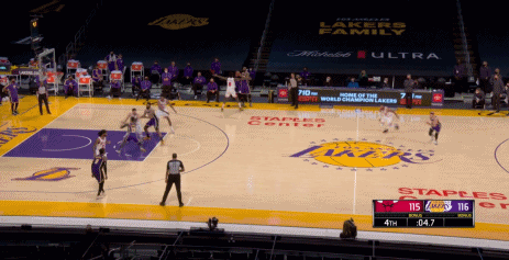 湖人在比赛最后时刻布置发边线球到后场,让丹尼斯-施罗德后场接球后运球消耗时间,最终比分领先的湖人几乎将比赛时间消耗殆尽,施罗德随后两罚一中锁定胜局。