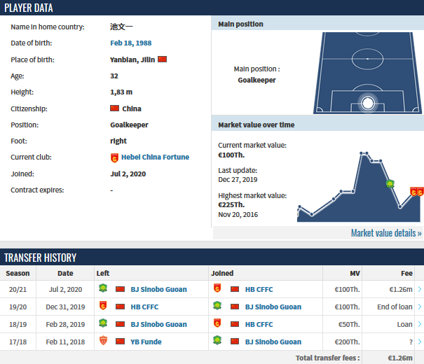 看球吧7月3日讯 据“德国转会市场”网站信息,河北华夏幸福从国安买断池文一,转会费为126万欧元(折合约人民币1000万元)。