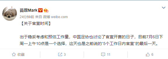 看球吧7月1日讯 今日,记者苗原发微博称足协将在7月6日官宣中超开赛。但在1小时后,足协官方就发布了中超开赛的公告。