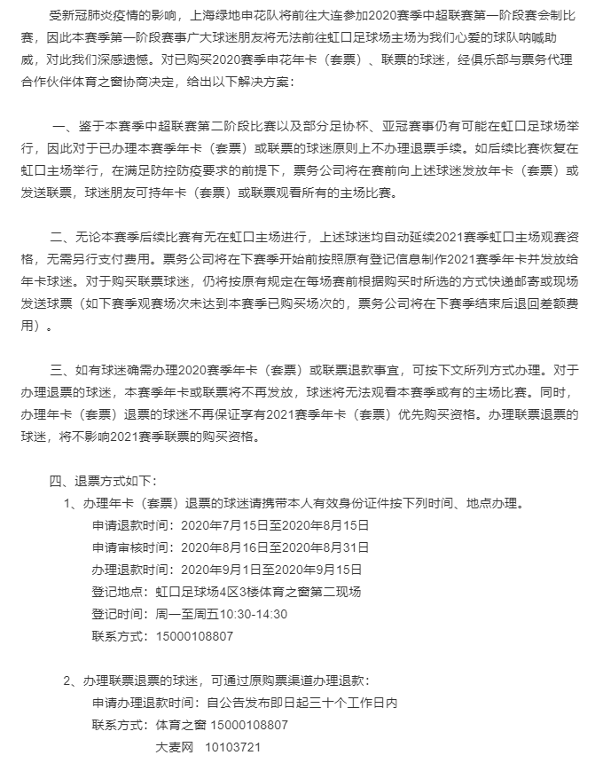 看球吧7月8日讯 申花官方发布公告表示,对于已办理本赛季年卡(套票)或联票的球迷原则上不办理退票手续,无论本赛季后续比赛有无在虹口主场进行,上述球迷均自动延续2021赛季虹口主场观赛资格,无需另行支付费用。如有球迷确需办理2020赛季年卡(套票)或联票退款事宜,可携带证件来到虹口足球场线下登记办理。