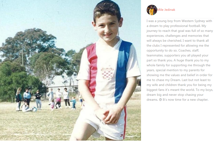 看球吧7月13日讯 最近,参加过三次世界杯的澳大利亚队长耶迪纳克在个人Ins宣布正式退役。