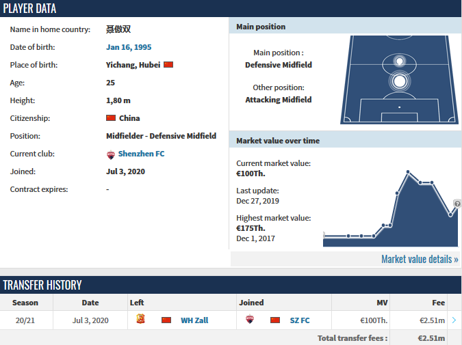 看球吧7月16日讯 据“德国转会市场”网站信息,武汉卓尔球员聂傲双转会加盟大连人,转会费为251万欧元(折合约人民币2000万元)。