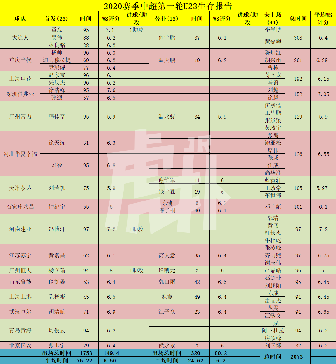 看球吧7月27日讯 今晚,中超联赛结束了第一阶段第一轮的比赛。本轮共有9名U23球员打满全场,3名球员送出助攻。