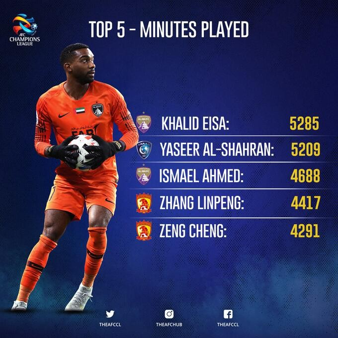 看球吧7月12日讯 亚冠联赛官方统计了此前6个赛季在亚冠联赛出场时间最多的五名球员,中国球员张琳芃、曾诚上榜。 出场时间最多的五名球员